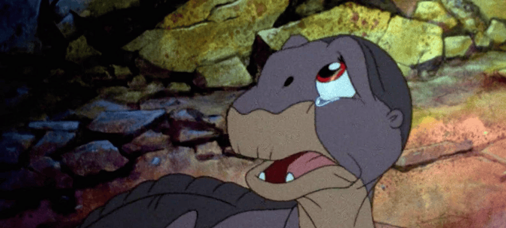 Dirigido por Don Bluth, o clássico acompanha um jovem brontossauro órfão que atravessa territórios hostis ao lado de novos amigos para reencontrar a família. A aventura inclui passagens sobre fome, escassez, preconceito e luto.
